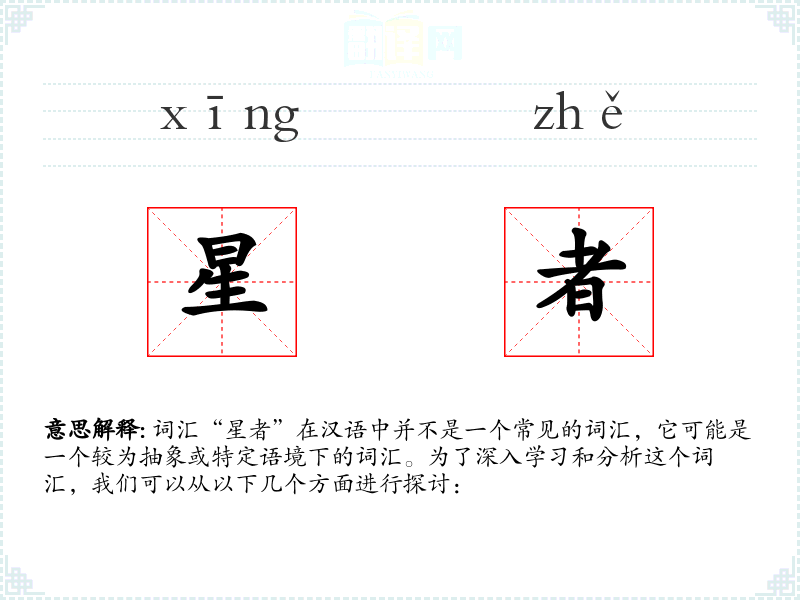 词汇“星者”在汉语中并不是一个常见的词汇,它可能是一个较为抽象或特定语境下的词汇。为了深入学*和分析这个词汇,我们可以从以下几个方面进行探讨: