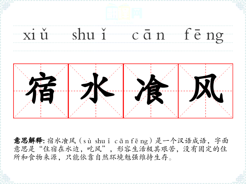 宿水飡风(sù shuǐ cān fēng)是一个汉语成语,字面意思是“住宿在水边,吃风”,形容生活极其艰苦,没有固定的住所和食物来源,只能依靠自然环境勉强维持生存。