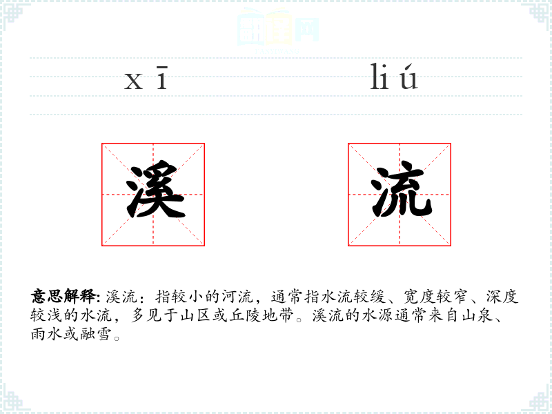 溪流:指较小的河流,通常指水流较缓、宽度较窄、深度较浅的水流,多见于山区或丘陵地带。溪流的水源通常来自山泉、雨水或融雪。