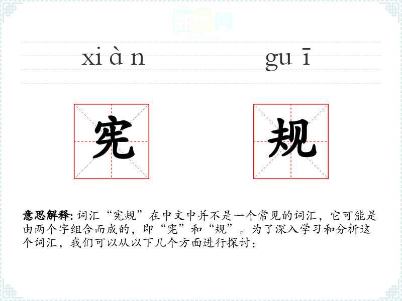 词汇“宪规”在中文中并不是一个常见的词汇,它可能是由两个字组合而成的,即“宪”和“规”。为了深入学习和分析这个词汇,我们可以从以下几个方面进行探讨:
