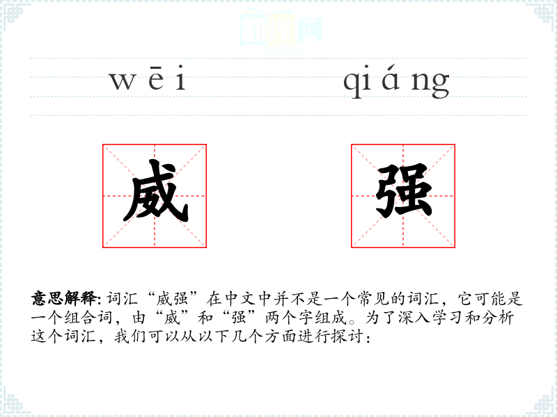 词汇“威强”在中文中并不是一个常见的词汇,它可能是一个组合词,由“威”和“强”两个字组成。为了深入学习和分析这个词汇,我们可以从以下几个方面进行探讨: