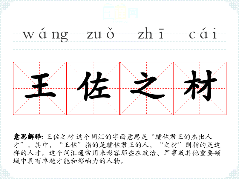 王佐之材 这个词汇的字面意思是“辅佐君王的杰出人才”。其中,“王佐”指的是辅佐君王的人,“之材”则指的是这样的人才。这个词汇通常用来形容那些在政治、军事或其他重要领域中具有卓越才能和影响力的人物。