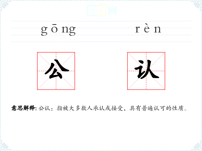 - 词源:“公认”由“公”和“认”两个字组成,“公”指公共的、大家的,“认”指承认、认可。
