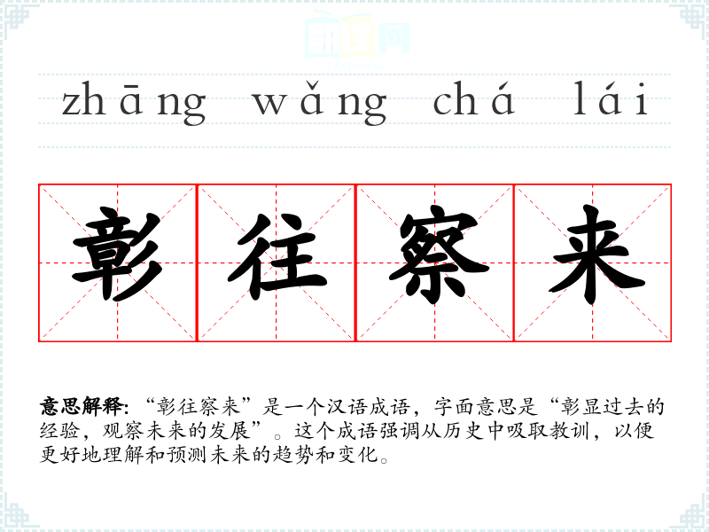 “彰往察来”是一个汉语成语,字面意思是“彰显过去的经验,观察未来的发展”。这个成语强调从历史中吸取教训,以便更好地理解和预测未来的趋势和变化。