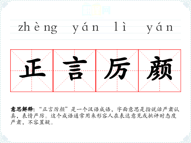 “正言厉颜”是一个汉语成语,字面意思是指说话严肃认真,表情严厉。这个成语通常用来形容人在表达意见或批评时态度严肃,不容置疑。