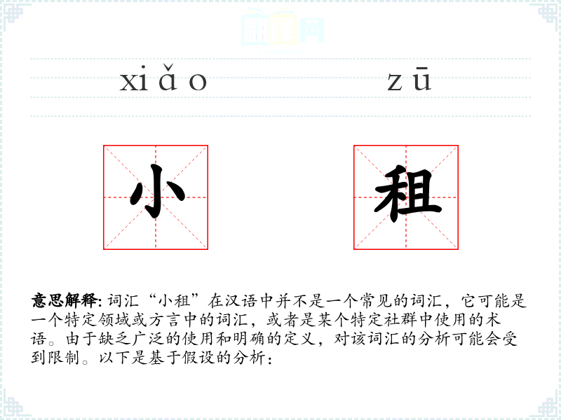 词汇“小租”在汉语中并不是一个常见的词汇,它可能是一个特定领域或方言中的词汇,或者是某个特定社群中使用的术语。由于缺乏广泛的使用和明确的定义,对该词汇的分析可能会受到限制。以下是基于假设的分析: