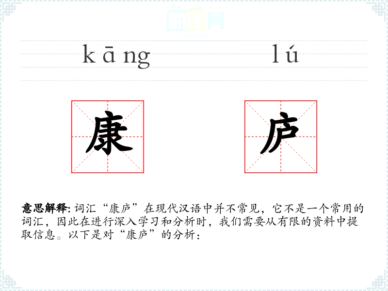 词汇“康庐”在现代汉语中并不常见,它不是一个常用的词汇,因此在进行深入学*和分析时,我们需要从有限的资料中提取信息。以下是对“康庐”的分析: