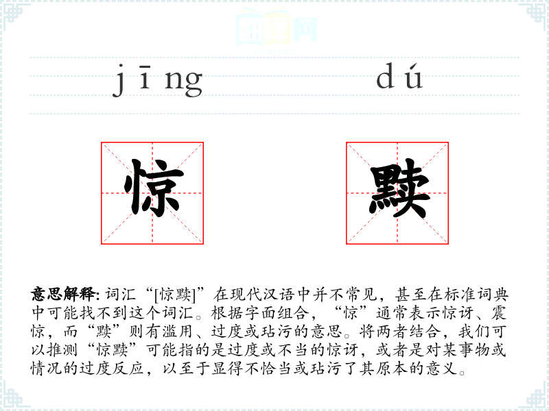 词汇“[惊黩]”在现代汉语中并不常见,甚至在标准词典中可能找不到这个词汇。根据字面组合,“惊”通常表示惊讶、震惊,而“黩”则有滥用、过度或玷污的意思。将两者结合,我们可以推测“惊黩”可能指的是过度或不当的惊讶,或者是对某事物或情况的过度反应,以至于显得不恰当或玷污了其原本的意义。