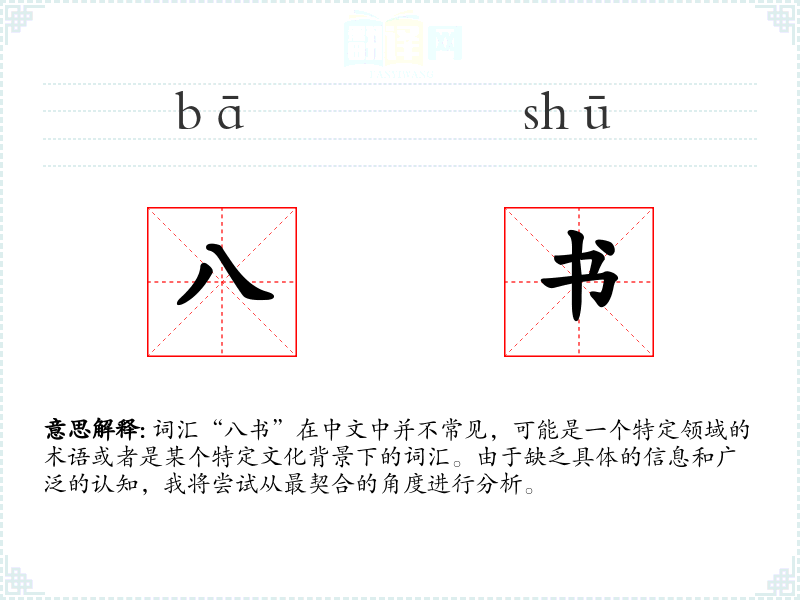 由于“八书”不是一个广为人知的词汇,它在不同语言或文化中的对应词汇及其使用情况可能非常有限。