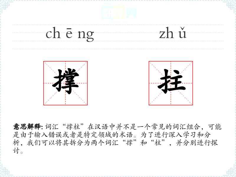 词汇“撑柱”在汉语中并不是一个常见的词汇组合,可能是由于输入错误或者是特定领域的术语。为了进行深入学习和分析,我们可以将其拆分为两个词汇“撑”和“柱”,并分别进行探讨。