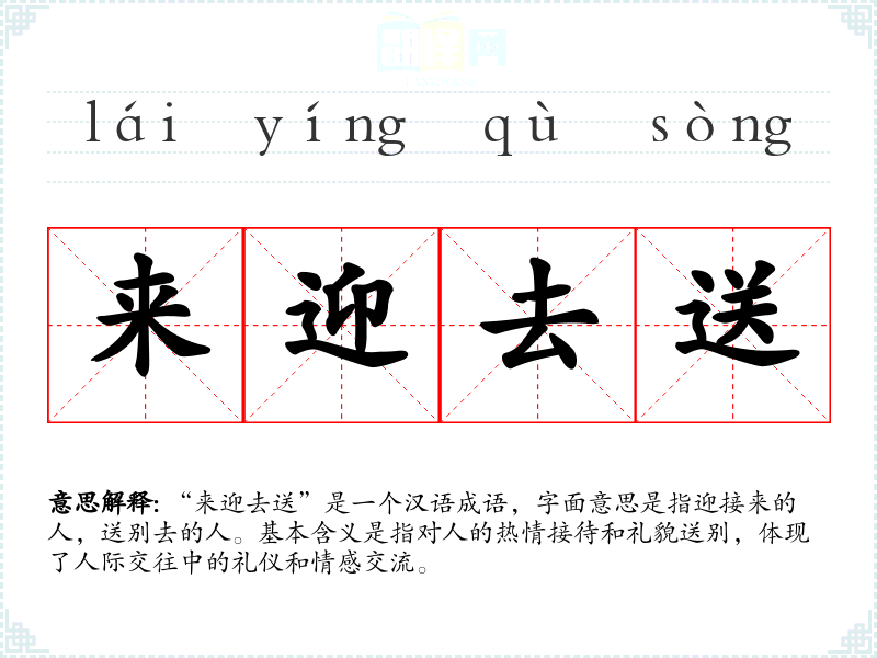 “来迎去送”是一个汉语成语,字面意思是指迎接来的人,送别去的人。基本含义是指对人的热情接待和礼貌送别,体现了人际交往中的礼仪和情感交流。