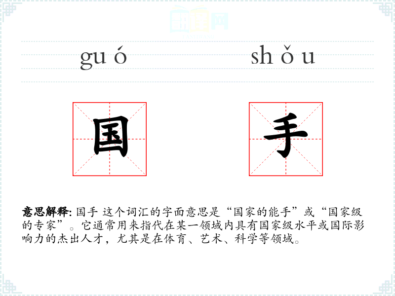 国手 这个词汇的字面意思是“国家的能手”或“国家级的专家”。它通常用来指代在某一领域内具有国家级水平或国际影响力的杰出人才,尤其是在体育、艺术、科学等领域。