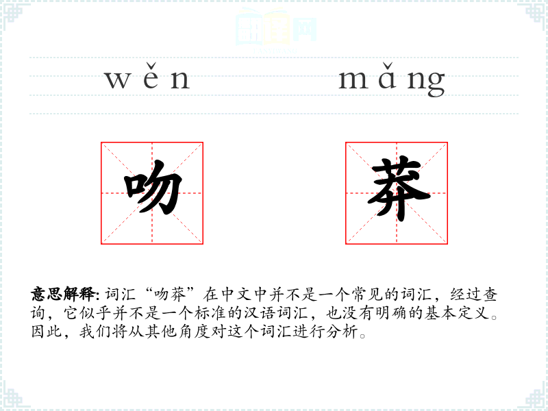 由于“吻莽”不是一个标准的汉语词汇,我们无法提供其字面意思和基本含义。