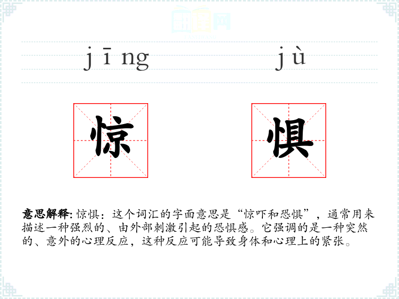 惊惧:这个词汇的字面意思是“惊吓和恐惧”,通常用来描述一种强烈的、由外部刺激引起的恐惧感。它强调的是一种突然的、意外的心理反应,这种反应可能导致身体和心理上的紧张。