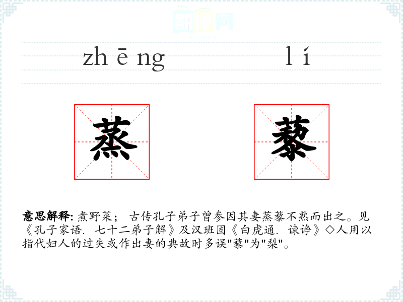 煮野菜; 古传孔子弟子曾参因其妻蒸藜不熟而出之。见《孔子家语.七十二弟子解》及汉班固《白虎通.谏诤》◇人用以指代妇人的过失或作出妻的典故时多误"藜"为"梨"。