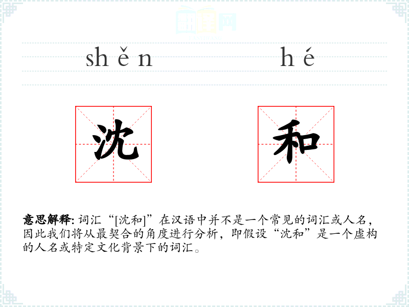 “沈和”可以被理解为一个由两个汉字组成的名字,其中“沈”通常用作姓氏,而“和”则有和谐、和平的含义。