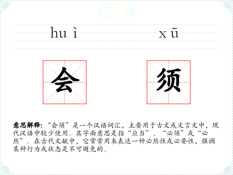 “会须”是一个汉语词汇,主要用于古文或文言文中,现代汉语中较少使用。其字面意思是指“应当”、“必须”或“必然”。在古代文献中,它常常用来表达一种必然性或必要性,强调某种行为或状态是不可避免的。