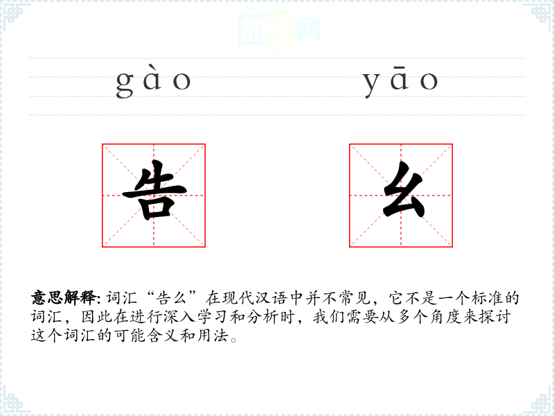 词汇“告么”在现代汉语中并不常见,它不是一个标准的词汇,因此在进行深入学习和分析时,我们需要从多个角度来探讨这个词汇的可能含义和用法。