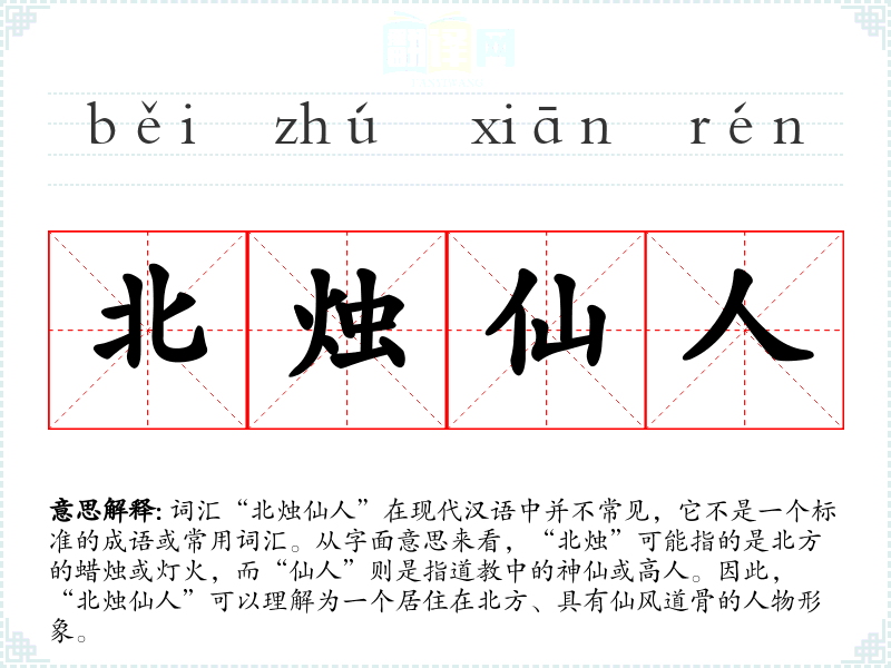 词汇“北烛仙人”在现代汉语中并不常见,它不是一个标准的成语或常用词汇。从字面意思来看,“北烛”可能指的是北方的蜡烛或灯火,而“仙人”则是指道教中的神仙或高人。因此,“北烛仙人”可以理解为一个居住在北方、具有仙风道骨的人物形象。