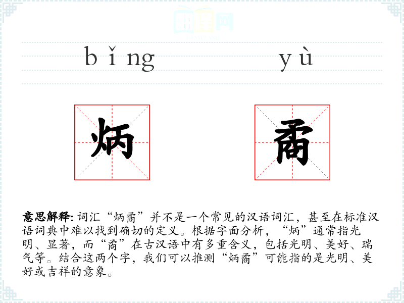 词汇“炳矞”并不是一个常见的汉语词汇,甚至在标准汉语词典中难以找到确切的定义。根据字面分析,“炳”通常指光明、显著,而“矞”在古汉语中有多重含义,包括光明、美好、瑞气等。结合这两个字,我们可以推测“炳矞”可能指的是光明、美好或吉祥的意象。