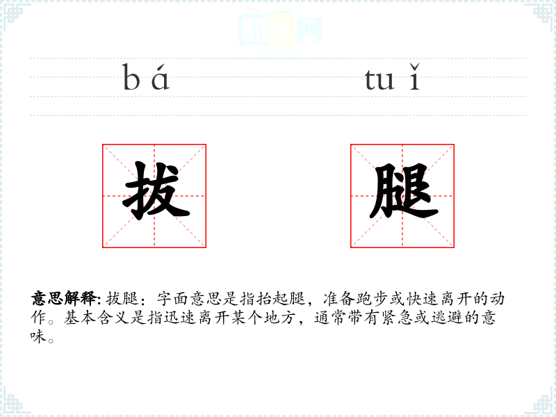 拔腿:字面意思是指抬起腿,准备跑步或快速离开的动作。基本含义是指迅速离开某个地方,通常带有紧急或逃避的意味。