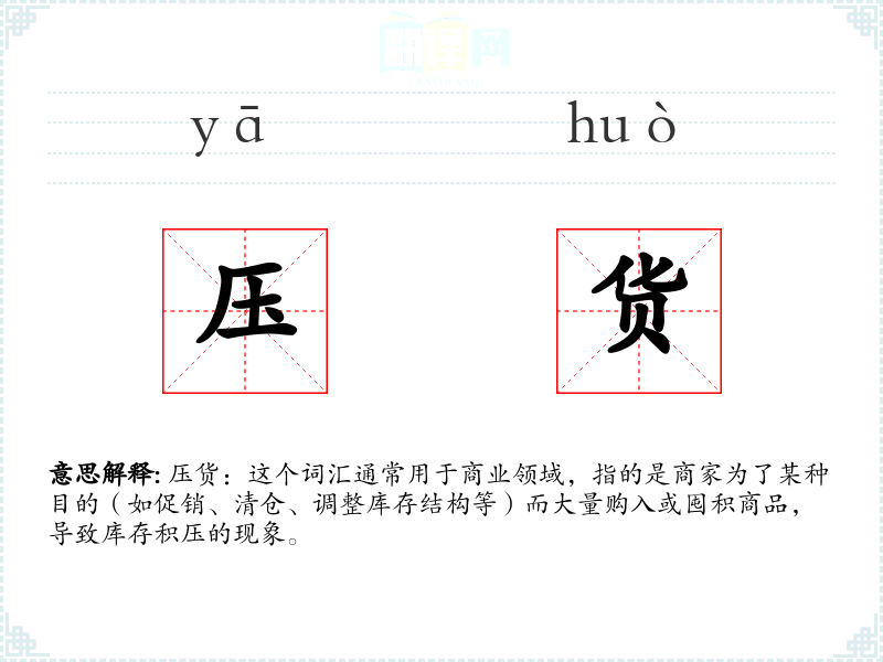 压货:这个词汇通常用于商业领域,指的是商家为了某种目的(如促销、清仓、调整库存结构等)而大量购入或囤积商品,导致库存积压的现象。