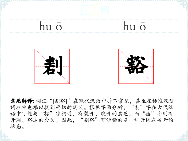 词汇“[剨豁]”在现代汉语中并不常见,甚至在标准汉语词典中也难以找到确切的定义。根据字面分析,“剨”字在古代汉语中可能与“豁”字相近,有裂开、破开的意思,而“豁”字则有开阔、豁达的含义。因此,“剨豁”可能指的是一种开阔或破开的状态。