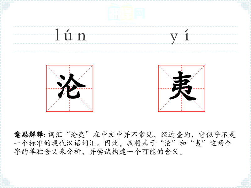 词汇“沦夷”在中文中并不常见,经过查询,它似乎不是一个标准的现代汉语词汇。因此,我将基于“沦”和“夷”这两个字的单独含义来分析,并尝试构建一个可能的含义。