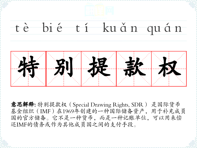 特别提款权(Special Drawing Rights, SDR) 是国际货币基金组织(IMF)在19*9年创建的一种国际储备资产,用于补充成员国的官方储备。它不是一种货币,而是一种记账单位,可以用来偿还IMF的债务或作为其他成员国之间的支付手段。