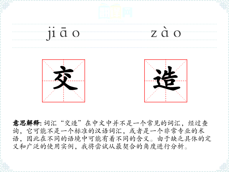 由于“交造”不是一个标准词汇,我们无法给出一个确切的基本定义。它可能是由“交”和“造”两个字组合而成的,其中“交”可能指的是交流、交叉或交织,而“造”可能指的是创造、建造或造访。因此,“交造”可能指的是某种形式的交流和创造的过程或结果。
