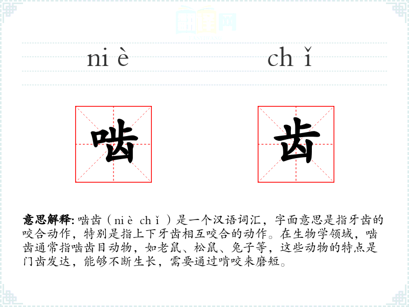 - 反义词:无(啮齿是一个描述特定动作的词汇,没有直接的反义词)