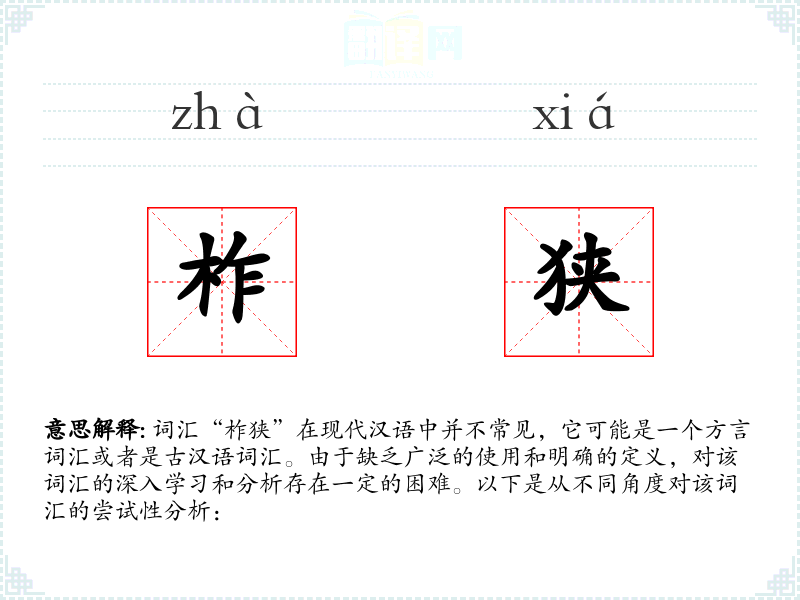 由于“柞狭”不是一个标准的现代汉语词汇,我们无法提供一个确切的基本定义。它可能是指某个地方的狭窄或狭小,或者是某种特定的状态或情况。