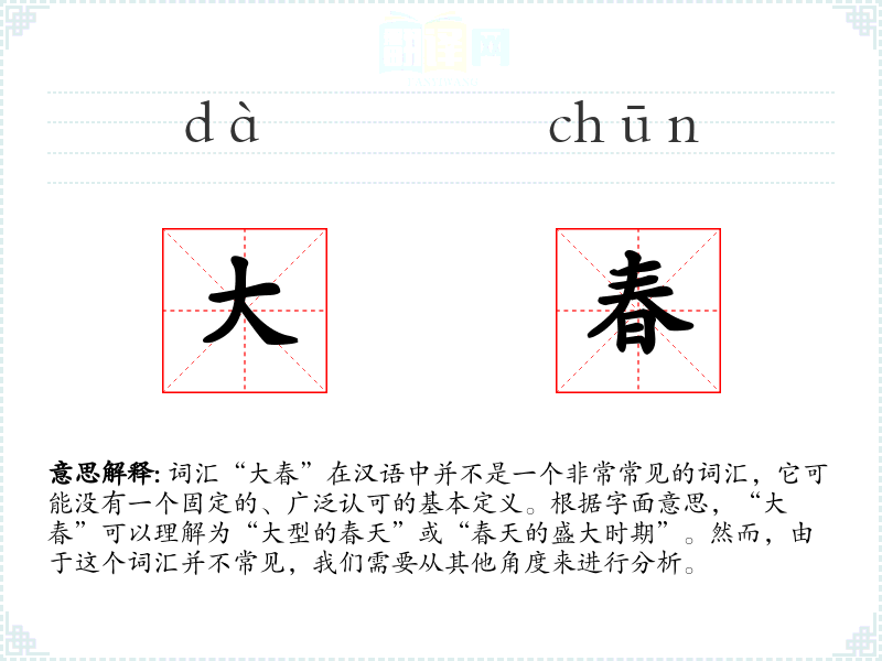 词汇“大春”在汉语中并不是一个非常常见的词汇,它可能没有一个固定的、广泛认可的基本定义。根据字面意思,“大春”可以理解为“大型的春天”或“春天的盛大时期”。然而,由于这个词汇并不常见,我们需要从其他角度来进行分析。