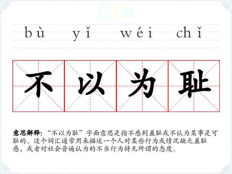 “不以为耻”字面意思是指不感到羞耻或不认为某事是可耻的。这个词汇通常用来描述一个人对某些行为或情况缺乏羞耻感,或者对社会普遍认为的不当行为持无所谓的态度。