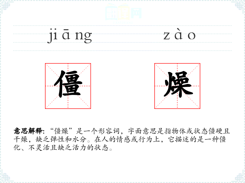 “僵燥”由“僵”和“燥”两个字组成,“僵”原指僵硬,“燥”指干燥。这两个字结合在一起,形成了描述僵硬且干燥状态的词汇。