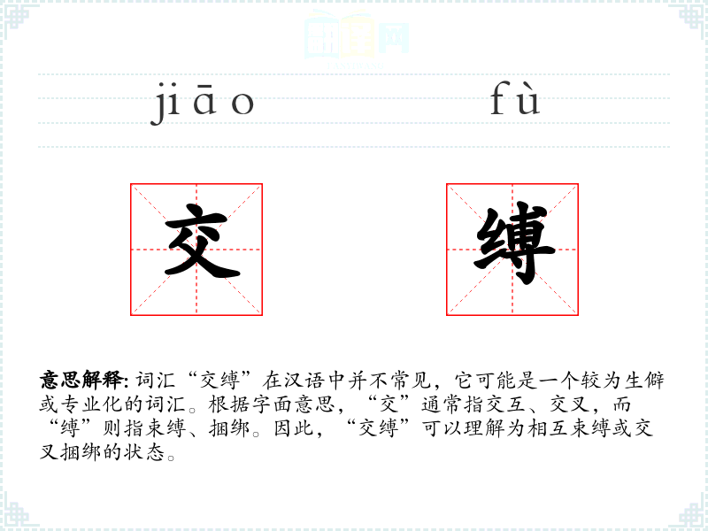 词汇“交缚”在汉语中并不常见,它可能是一个较为生僻或专业化的词汇。根据字面意思,“交”通常指交互、交叉,而“缚”则指束缚、捆绑。因此,“交缚”可以理解为相互束缚或交叉捆绑的状态。