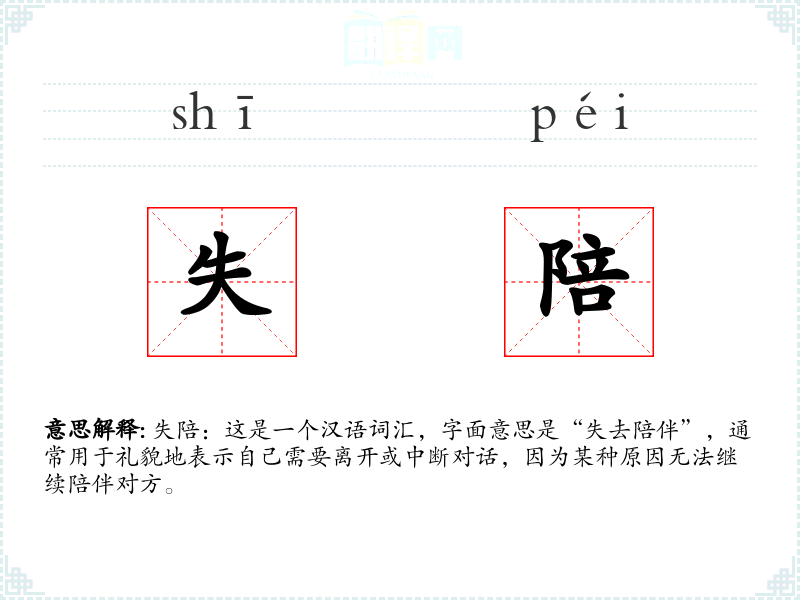 失陪:这是一个汉语词汇,字面意思是“失去陪伴”,通常用于礼貌地表示自己需要离开或中断对话,因为某种原因无法继续陪伴对方。
