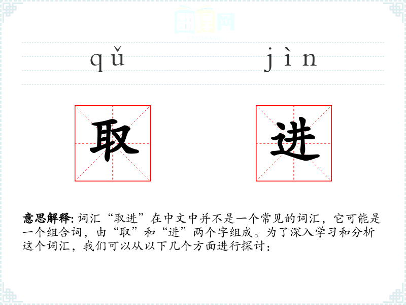 “取进”这个词组虽然不常见,但它传达了一种积极向上的态度和行为。在语言学习和表达中,了解和使用这样的词汇可以帮助我们更准确地表达自己的意图和情感。