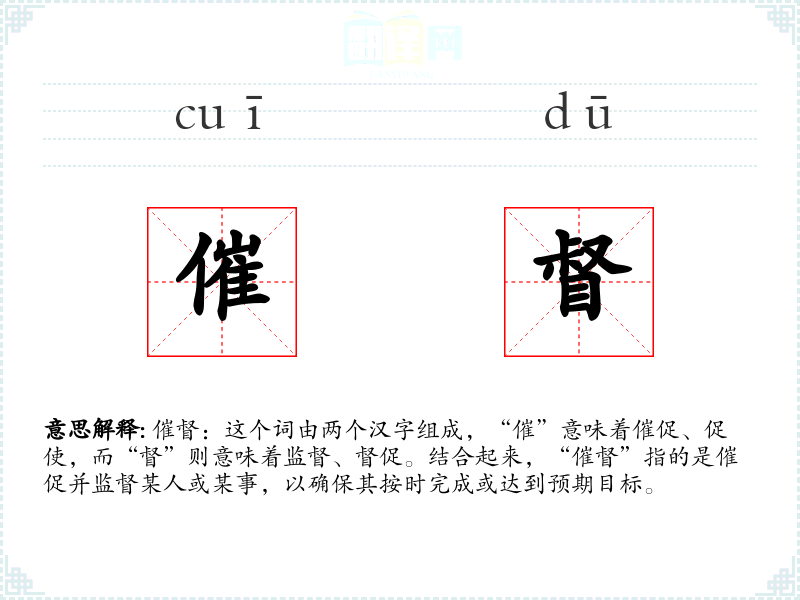 催督:这个词由两个汉字组成,“催”意味着催促、促使,而“督”则意味着监督、督促。结合起来,“催督”指的是催促并监督某人或某事,以确保其按时完成或达到预期目标。