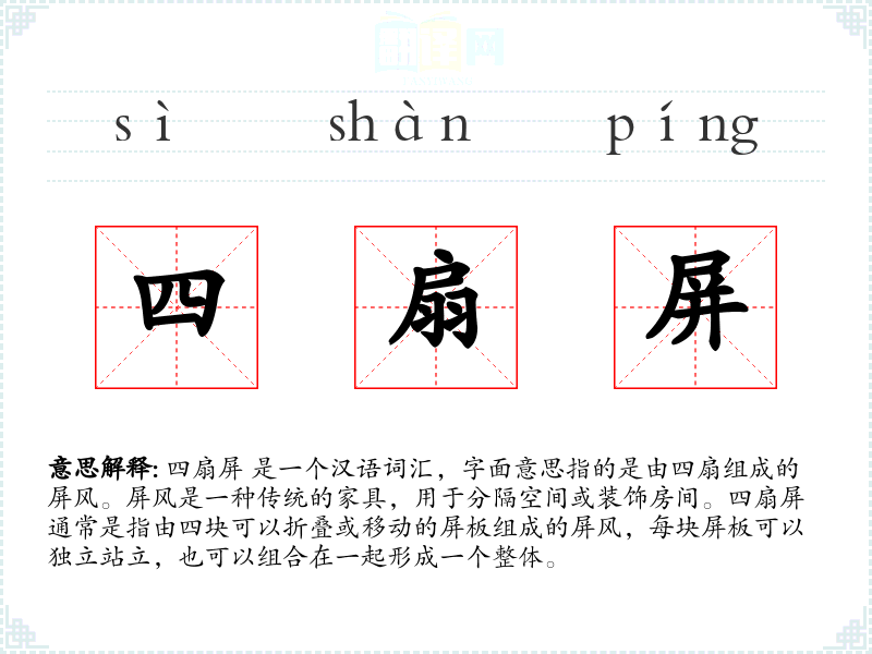 四扇屏 是一个汉语词汇,字面意思指的是由四扇组成的屏风。屏风是一种传统的家具,用于分隔空间或装饰房间。四扇屏通常是指由四块可以折叠或移动的屏板组成的屏风,每块屏板可以独立站立,也可以组合在一起形成一个整体。