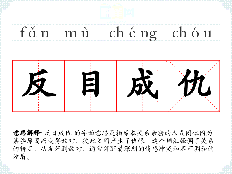 - 同义词:翻脸无情、结怨、成仇、敌对