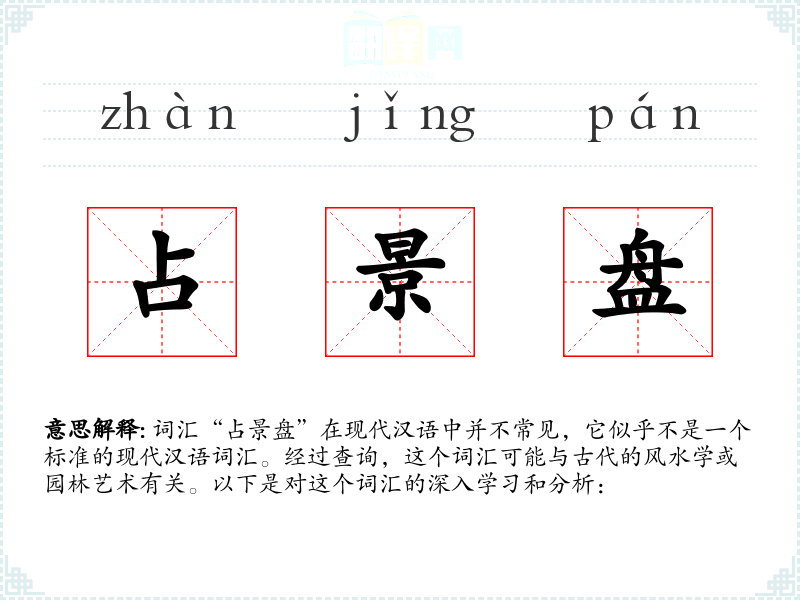 词汇“占景盘”在现代汉语中并不常见,它似乎不是一个标准的现代汉语词汇。经过查询,这个词汇可能与古代的风水学或园林艺术有关。以下是对这个词汇的深入学*和分析: