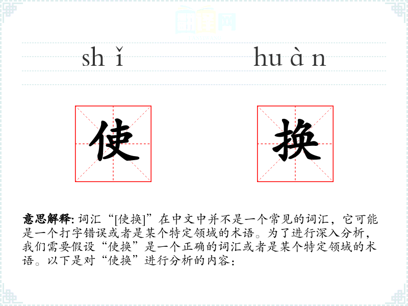 “使换”的字面意思可能是指“使某物更换”或“使某物转换”。基本含义可能是指通过某种手段或过程,使某物从一种状态或形式转变为另一种状态或形式。