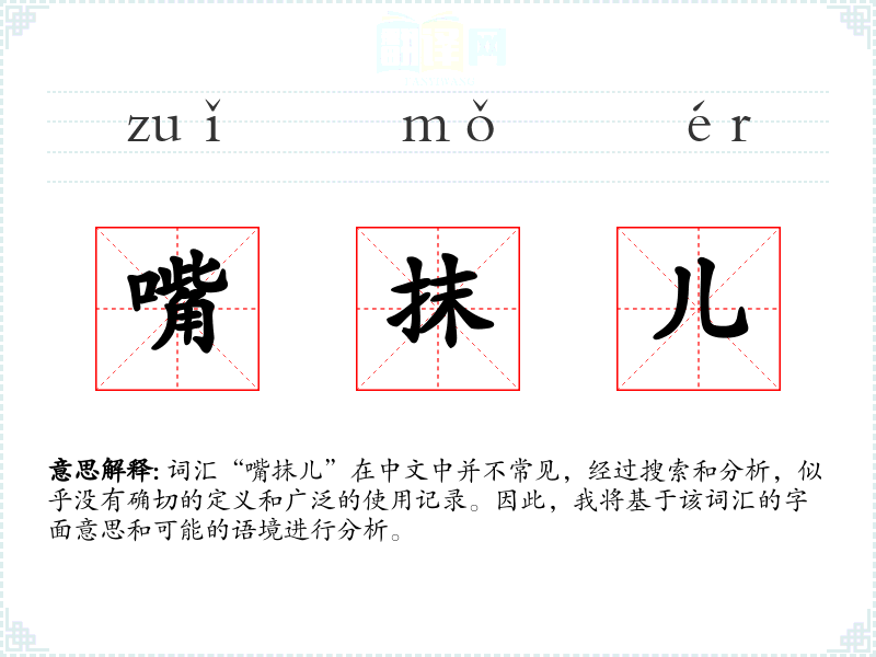 词汇“嘴抹儿”在中文中并不常见,经过搜索和分析,似乎没有确切的定义和广泛的使用记录。因此,我将基于该词汇的字面意思和可能的语境进行分析。
