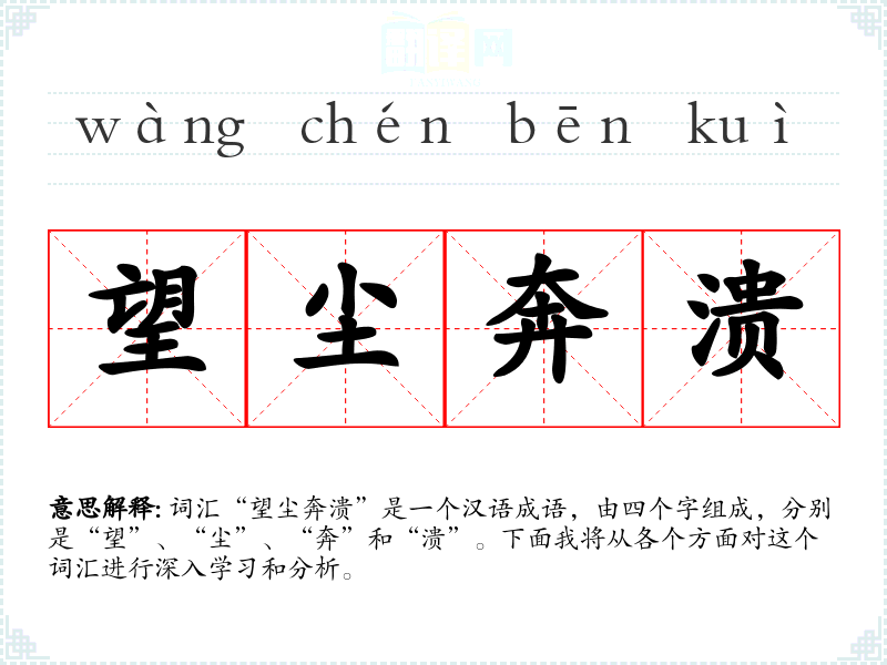 词汇“望尘奔溃”是一个汉语成语,由四个字组成,分别是“望”、“尘”、“奔”和“溃”。下面我将从各个方面对这个词汇进行深入学*和分析。