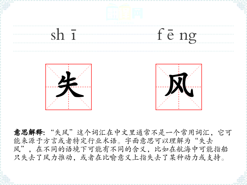 “失风”这个词汇在中文里通常不是一个常用词汇,它可能来源于方言或者特定行业术语。字面意思可以理解为“失去风”,在不同的语境下可能有不同的含义,比如在航海中可能指船只失去了风力推动,或者在比喻意义上指失去了某种动力或支持。