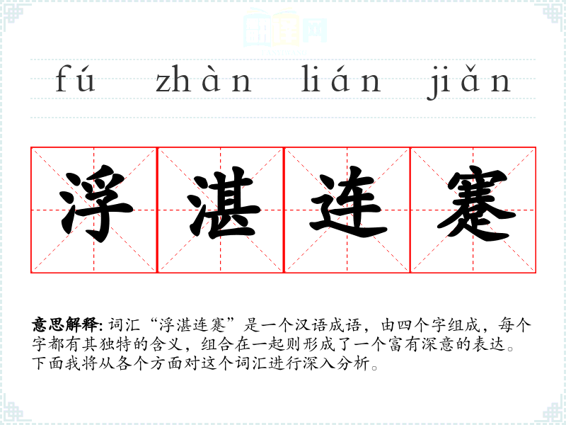 词汇“浮湛连蹇”是一个汉语成语,由四个字组成,每个字都有其独特的含义,组合在一起则形成了一个富有深意的表达。下面我将从各个方面对这个词汇进行深入分析。