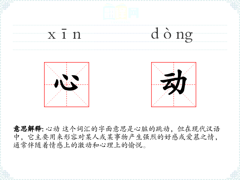 心动 这个词汇的字面意思是心脏的跳动,但在现代汉语中,它主要用来形容对某人或某事物产生强烈的好感或爱慕之情,通常伴随着情感上的激动和心理上的愉悦。