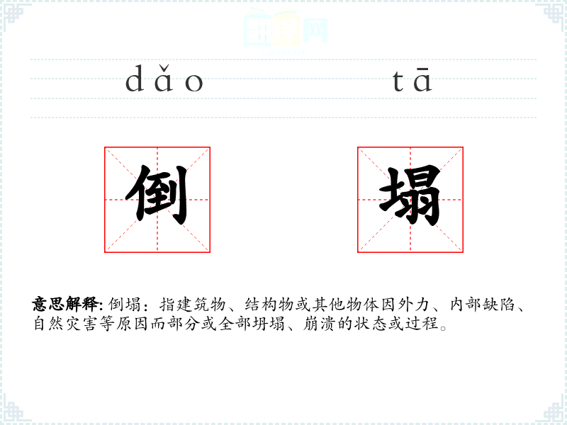 “倒塌”一词源自古代汉语,由“倒”和“塌”两个字组成,分别表示“倒下”和“塌陷”。随着时间的推移,这个词的含义逐渐固定,成为描述物体坍塌的常用词汇。