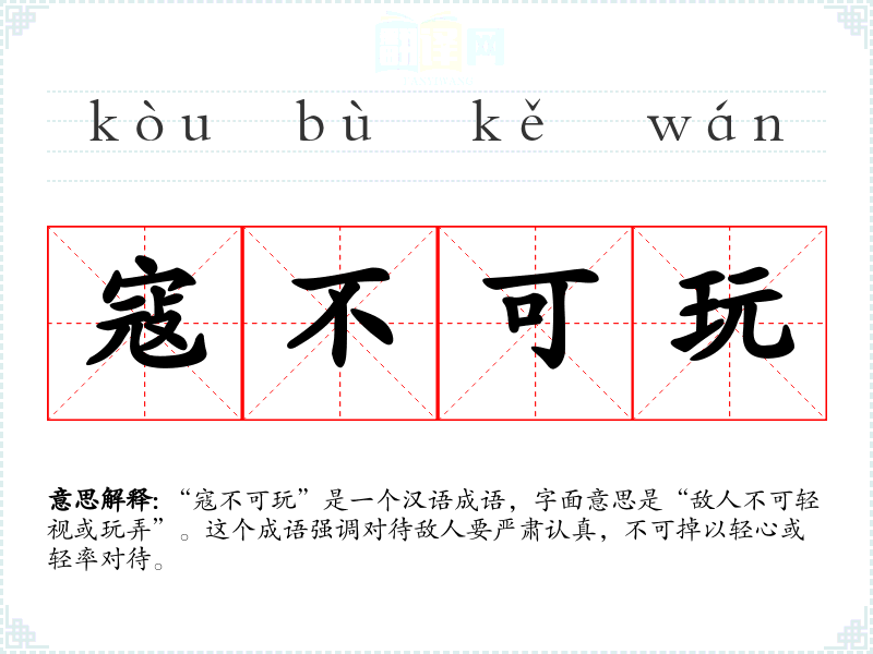 “寇不可玩”是一个汉语成语,字面意思是“敌人不可轻视或玩弄”。这个成语强调对待敌人要严肃认真,不可掉以轻心或轻率对待。